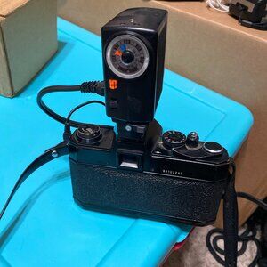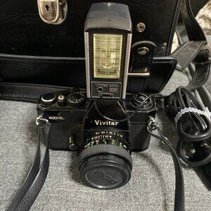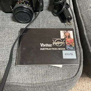 Vivitar 400 so camera. Only partially tested. Do not have film to fully test. The winding mechanism has a broken lever. You can still open the film tray but you have to use something like pliers to grip the lift mechanism or replace with a working lever. Flash has been tested and works. Works both while plugged in and held charge after being unplugged.