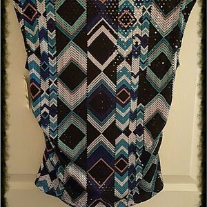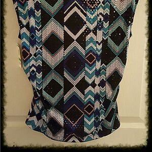 🎉🎉🎉Interesting geometric print layered w/ sequins makes this trendy piece eclectic in its own way. ⭐☀⭐Unique, sexy, sassy & sophisticated all at once! 💕💕Draped cowl neck + cinched gathering at hips adds to its style.👗 NWT.🌟💙💛🌟