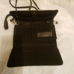 Black western buckle wristlet band wallet a tri-fold full featured wallet with a western setting interior features include three clear ID windows a two chamber accordion section with interior zippered pocket slots for nine credit cards flat currency compartment an exterior zippered pocket on the back.Both shoulder and wrist strap are detachable top flap has magnetic snap closure made of simulated leather construction fully lined interior has silver toned hardware 24 inch drop length.