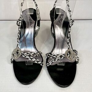 BLACK, WHITE & SILVER BRAID 4” HEEL SANDAL w RHINESTONES SAMDAL SIZE 8 EUC