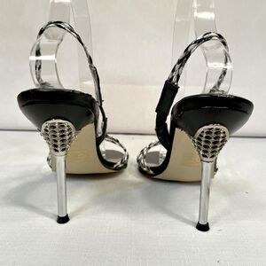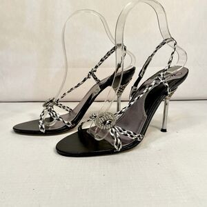 BLACK, WHITE & SILVER BRAID 4” HEEL SANDAL w RHINESTONES SAMDAL SIZE 8 EUC