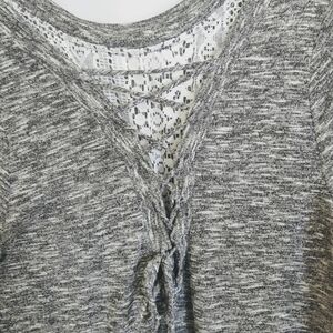 This top is longer in the back, Lace and ties in the back, worn a few times.
