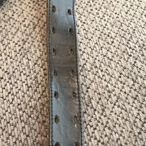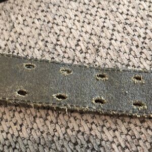 1.75” wide black leather belt with 2 rows of holes. Belt is 53” long. Pre-owned and in good used condition. Signs of normal wear are shown in the pictures.
