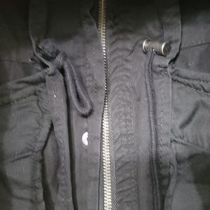 womens black cotton jacket from prince & fix. has two pockets at the waist and two breast pockets. all buttons and zippers are intact and work as they should. does have a hood. on the inside it has two clasps to singe the waist. would look great casual with any shirt or even a dress shirt and jeans. this jacket is a size medium.
