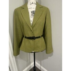 Elevate your wardrobe with this stylish and versatile BLACKER Green 2-Piece Business/Career Jacket and Pleated Skirt Suit in size 10. Perfect for any occasion, this suit features a classic fit, with a single-breasted jacket cut and a three-button front button style. The shawl lapel style and belted waist add a touch of sophistication to the outfit, making it suitable for weddings, parties, or business events.
