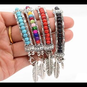 Red beaded, alloy Tibetan good luck feather charm bracelet