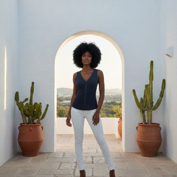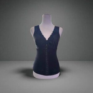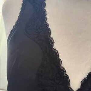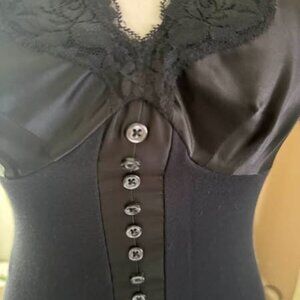 This playful black satin top in size XS is perfect for a stylish night out. It features decorative buttons down the front, delicate lace around the neckline, and a satin panel across the bust for a chic look. With stretchy fabric for a comfortable fit, it measures 22 inches long and 14 inches wide from armpit to armpit. Get ready to turn heads with this adorable and flattering piece!