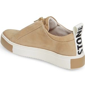 BLACKSTONE RL62 Tan Leather Zip Front Sneaker Color: Incense Leather A gleaming zip closure and color-coordinated bumpers at the heel and toe kick up the spirited attitude of a street-chic sneaker. Toe style: closed toe 1" heel; 1" platform Front zip closure Cushioned footbed Leather upper and lining/rubber sole Size 37 (US 6.5 - 7) Whole sizes only; for 1/2 sizes, order next size up. New in box