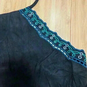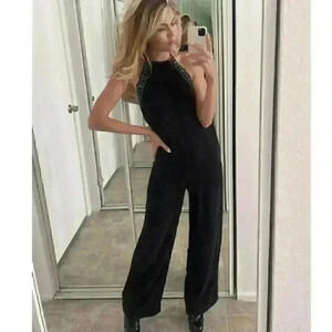 BLACK SUEDE Eyelet Embroidered Trim Self-Tie Halter Neck Open Back Jumpsuit