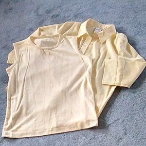 The tank features premium interlock knit, wide shoulders for full coverage, & scooped neckline. Size small petite. Approx 24". 60% cotton/40% polyester.