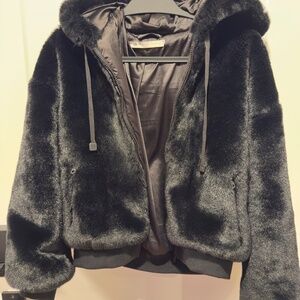 BLANC NOIR - Black Faux Fur Hooded Coat SIZE: M