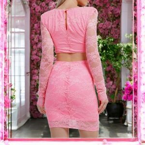 Item Features: Neon pink, solid color, floral lace, v-neck, long sleeve, padded shoulders, side cut-out, open lower back, back keyhole, back button closure, lined, strechy, sexy, clubwear, night-out, girlish, hot