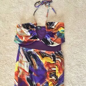 Eye-catching strapless maxi dress with a vibrant multicolor pattern. Features a mix of purple, red, blue, and orange hues.