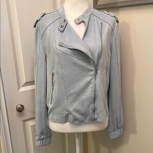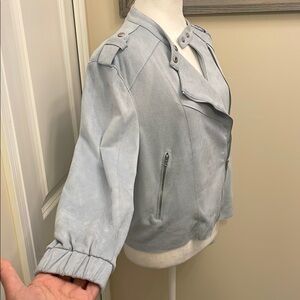 BLANK NYC Blue Suede Moto Jacket with Asymmetrical Design and Lapels.