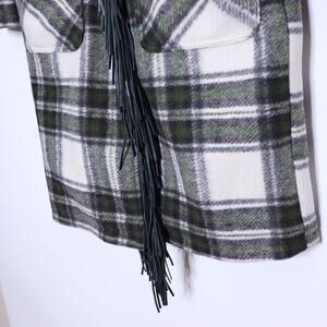 BLANK NYC Fleece Mid Length Coat Green Plaid Collared Fringe Hem Women's XS