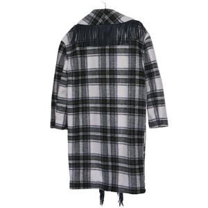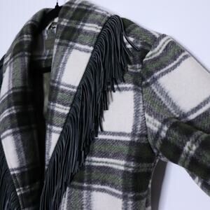 Wool like heavyweight knee length coat. Green tartan plaid and long faux leather fringe. Crafted from heavyweight, non-stretch polyester. Featuring an oversized collared neck, long sleeves with button cuffs, and a 3 button-front placket. Fully lined.