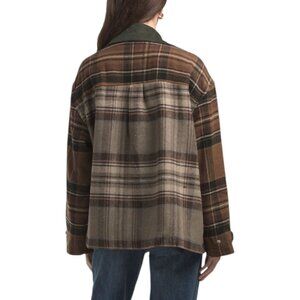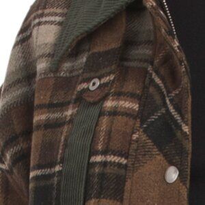 plaid pattern, corduroy collar and trim, 2 front button pockets, 2 front zip pockets, 2 chest pockets, fully lined, adjustable snap button cuffs, mixed media design