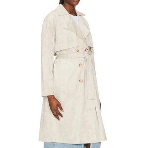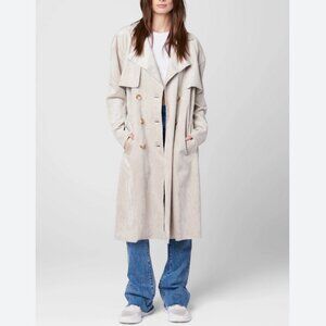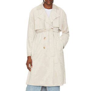 *90% polyester, 10% spandex. Front button closure. Removable waist tie. Side slip pockets. Back vent.