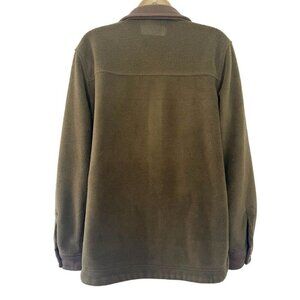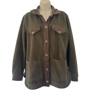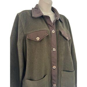 Blank NYC Fleece Shacket Jacket. Shacket is done in olive green with brown trim. It has a full button front and four front pockets. Shacket is made of a poly, cotton, spandex blend and is a woman's size small.