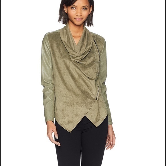Blank NYC woman’s olive drape front zip up jacket. Asymmetrical zipper closure, vegan leather sleeves.