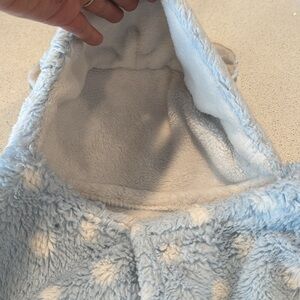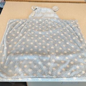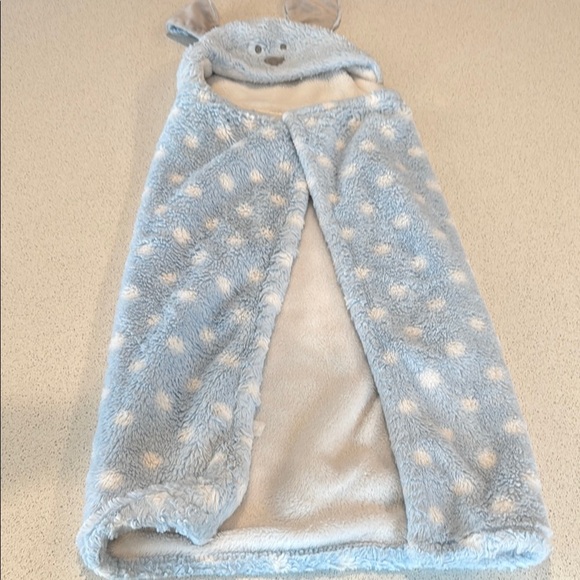 Adorable blue baby blanket with white polka dots. Features cute ears on the hood.