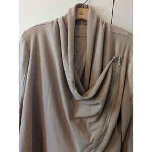 Draped jacket features faux leather elements with a chic asymmetrical hem for an ultra-stylish added layer.
