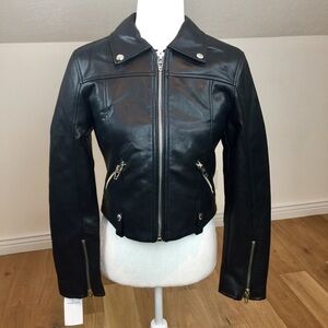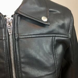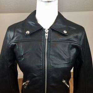Vegan Leather Moto Jacket with center front zipper detail. Sleek updated look.