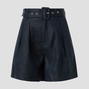 Blue linen (100% Linen, Lining: 95% Polyester, 5% Spandex). Shorts. Front zipper closure. 6" inseam. 13" rise. Imported.