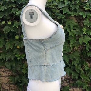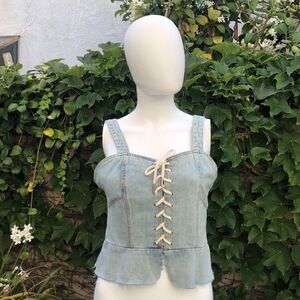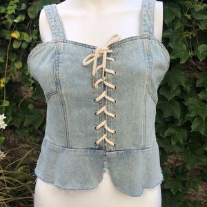 A braided cord weaves up the front of a corset-style top cut from soft, light-wash denim and finished with a fraying hem to keep the look casual. This style fits true to size.