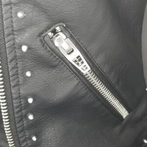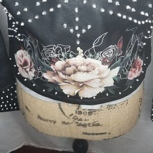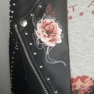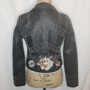 •Notch Collar, Faux Leather, Asymmetrical Front Zip, Printed, Studded, Floral, Moto Long Sleeves, Front Zip Pockets