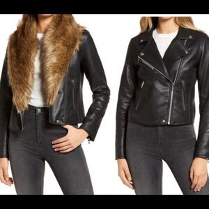A removable shawl collar of faux fur turns an already cool faux-leather moto jacket into one worthy of any rebellious fashion icon.