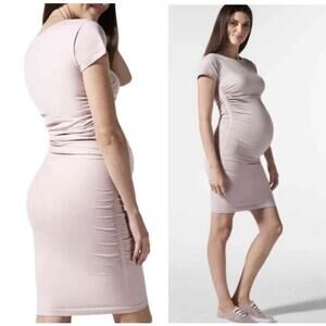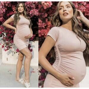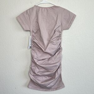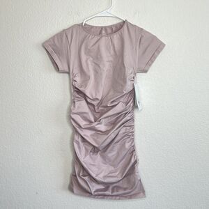 This casual mini dress by BLANQI features an asymmetrical design with a cap sleeve and a crew neck. The ruched detailing adds a stylish touch, while the soft pink hue makes it perfect for everyday wear.