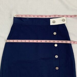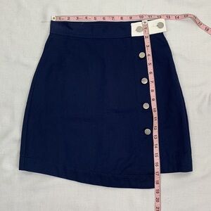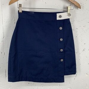 BLDWN size 0 Alexis Nocturnal Navy Asymmetrical Hem Wrap Button Mini Skirt. There is a tiny flaw on the waist line besides that in good preowned condition.