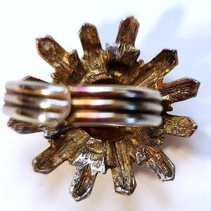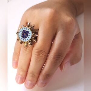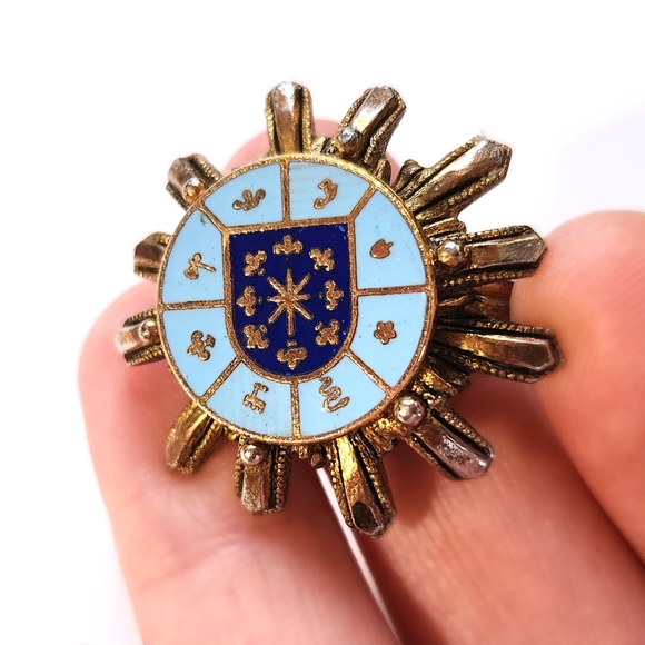 Keywords: Vintage VTG Antique Ring Sun Sunburst Sundial Celestial Crest Shield Blue Gold Metal Victorian Edwardian Medieval Renaissance RenFaire Cosplay LARP Theatre Theater Thespian Regal Brass GoldTone 80s 70s 60s 50s FleurDeLis Costume CostumeJewelry CostumeJewellery Jewelry Jewellery Enamel ArtDeco Royalty Shiny Maximalism