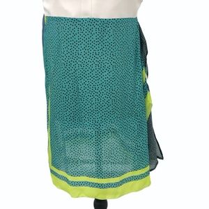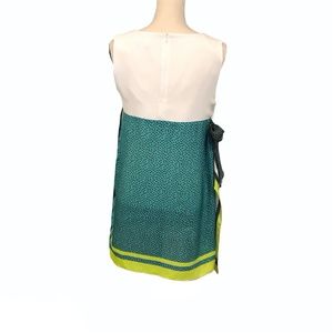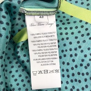 Bleu Blanc Rouge bib front embroidered silk dress. French size 42 = USA 10. White top with blue ribbon with offset sequin flowers on lace outlined with pearl and stones. Body of the dress is green, navy, white & chartreuse. Garment has been altered under the arms. See pictures. In very good preowned condition.