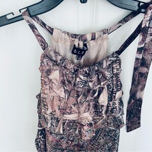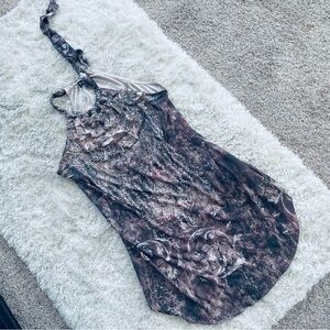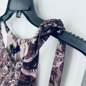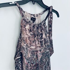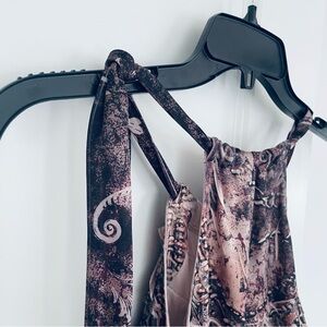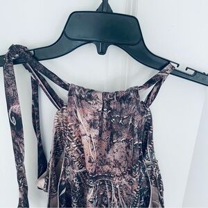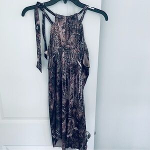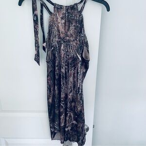 Silky dress (100% polyester) with halter neck that ties. Ruffles on chest and sparkle details throughout dress. Nude/Brown with blush pink patterns. Dress is longer in front and back and is shorter on sides.