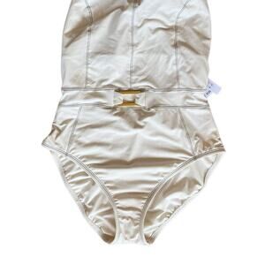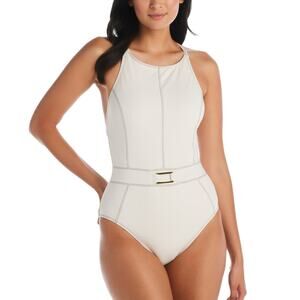 BLEU ROD BEATTIE Belted One Piece Swimsuit Molded Cups Sweetheart Neck White 10