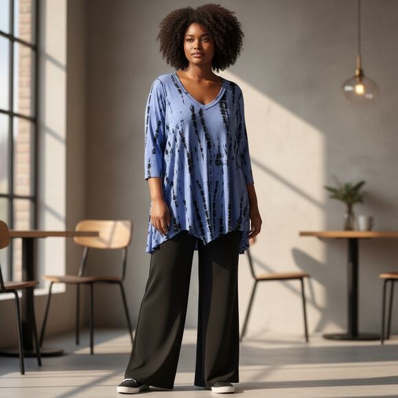 Flowy, flattering, and full of personality—this B-L-E-U tunic brings everyday comfort with a stylish twist. The royal blue and black tie-dye pattern adds an artistic edge, while the soft rayon-spandex blend drapes beautifully over curves. The V-neckline elongates your silhouette, and the center-point hem in front and back gives it an effortlessly chic vibe. Perfect for pairing with leggings or wide-leg pants.