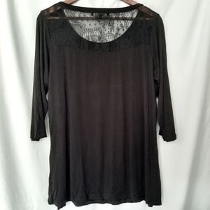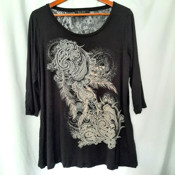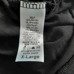 B.L.E.U. top is made of 95 rayon and 5 spandex. Lace portion is back is made of 89 nylon and 11 spandex.