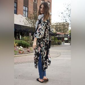 BLEUH CIEL Boho Kimono Style Duster Cardigan Robe Black Multicolor Floral Medium