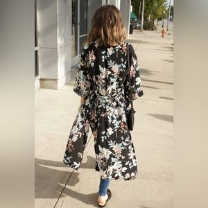 BLEUH CIEL Boho Kimono Duster Cardigan Robe Black Floral Women’s Medium Wrap Tie