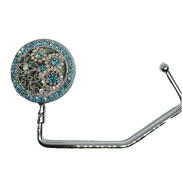 BLING FLORAL PURSE BAG HOOK HOLDER AQUA CRYSTAL FOLDING HANDBAG TABLE HANGER