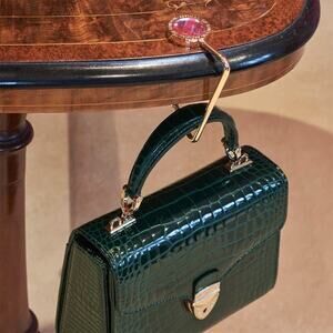 This elegant handbag hanger features a sparkling floral swirl design adorned with aqua rhinestones, iridescent stones, and silver detailing. The circular base highlights the brilliant crystals, creating a stylish and functional accessory. The hook folds flat for easy storage and hangs securely on the edge of any table to keep your handbag elevated, clean, and protected. Ideal for restaurants, offices, travel, and everyday use.