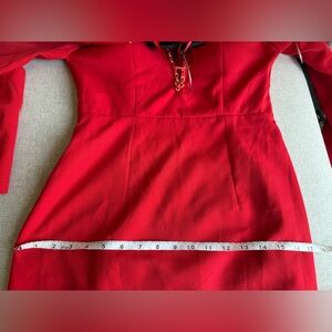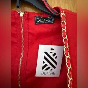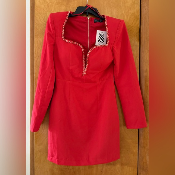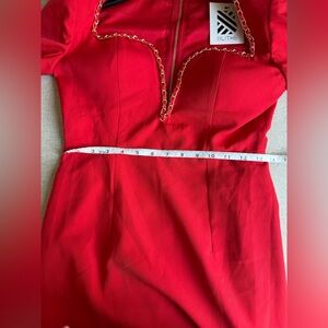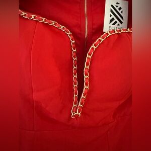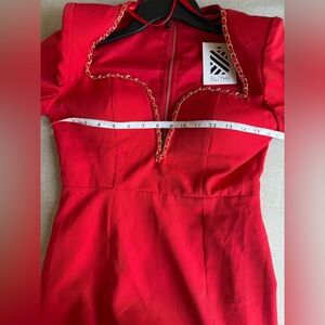 Red plunge dress, sweetheart neckline with chain detail