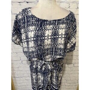 This is a stylish women's shirt dress by BLL New York in size Large. This knee-length dress features a blue and white geometric pattern, short sleeves, and a boat neck neckline. The dress is belted for a flattering silhouette and made from viscose fabric with a rayon texture. It is suitable for various occasions such as travel, casual outings, and workwear. The designer brand and bohemian style make it a versatile piece for any season. Ideal for those looking for a trendy and comfortable dress that can be dressed up or down for different looks. 20 inches pit to pit and 35 inches long. Smoke free home.
