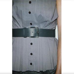 Strapless top with straight neckline. Bustier top with contrasting interior. Belt with metal buckle. Box pleated hem and side vents. Contrasting topstitching. Front button closure.
