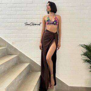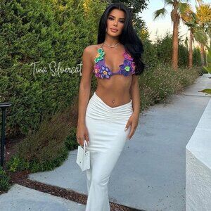 Triangle bra-style top. V-neck and adjustable braided ties on the neck and back. Raised floral detail.