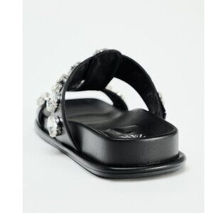 Black flat sandals. Embellished details at straps. Rounded toe.