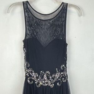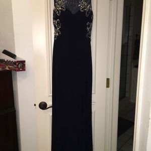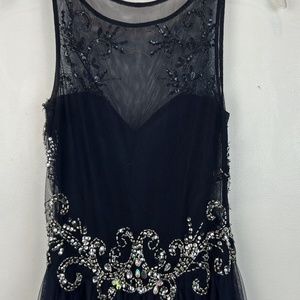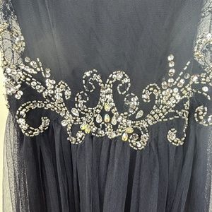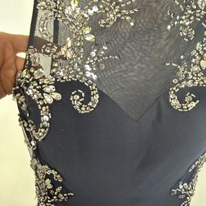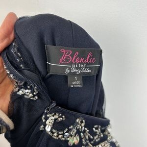Glamorous navy long gown featuring dramatic silver beading to the illusion mesh bodice. Size 1, back zipper, fully lined, slightly longer in the back for a flattering silhouette. Comfortable front slit for movement NEW WITH TAGS
