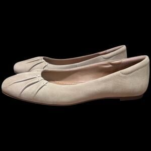 J.Jill Blondo Jannet in light beige nubuck. These flats are characterized by their classic ballet flat silhouette, ruched detailing at the toe, and a comfortable, flexible design. Blondo is known for it's waterproof footwear, and the Jannet flats are no exception, featuring waterproof leather or nubuck uppers. This makes them suitable for various weather conditions and easy to maintain.